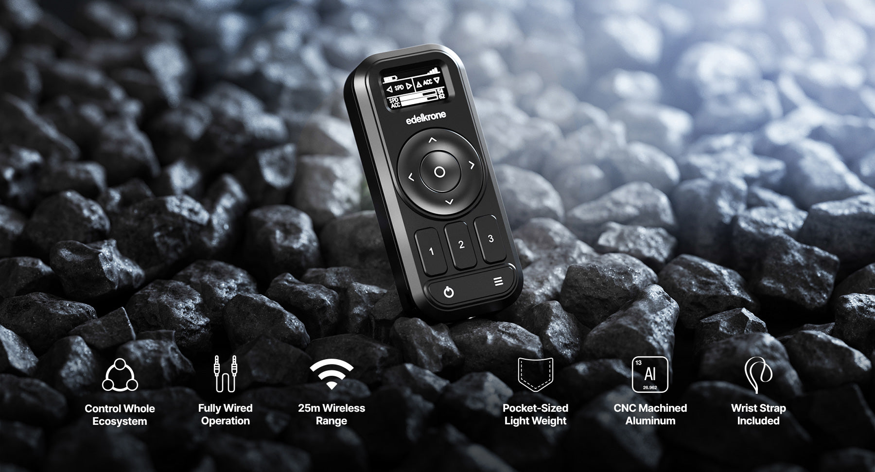Controller for edelkrone Moco is made of CNC machined aluminum for lifetime durability, and comes with a larger screen compared to the previous generation, while remaining as light as a smartphone, and small enough to fit in your pocket.