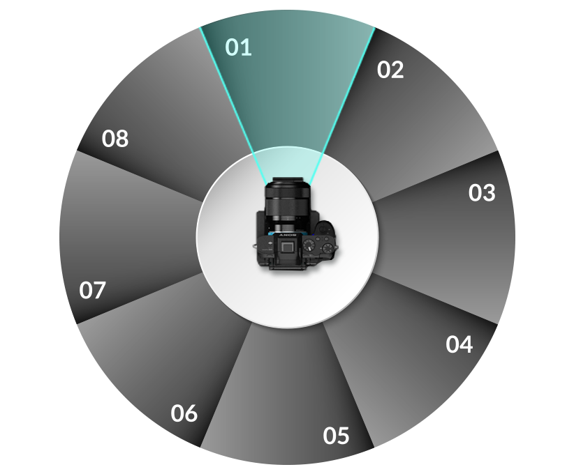360° mode allows you to take panoramic gigapixel photos as wide as 360 degrees. You take many photos next to each other line by line, and stitch them on the computer to get ultra high resolution and wide angle shots of any environment.